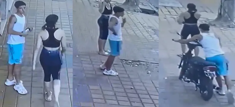 Una pareja de delincuentes aprovechó un descuido y, sin importarle las presencia de cámarase, se llevaron una moto caminando.