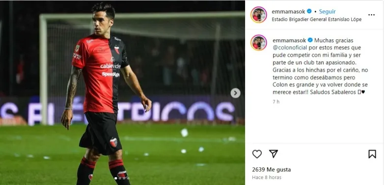 Este sábado, Emmanuel Más, quien es ídolo y una de las glorias de San Martínde San Juan, anunció su partida de Colón de Santa Fe. Sin embargo, el nuevo destino estaría muy cerca de la provincia, precisamente, en Mendoza. Allí, el lateral izquierdo defendería los colores azules de Independiente Rivadavia. Sin embargo, esto no cayó bien en el Pueblo Viejo.