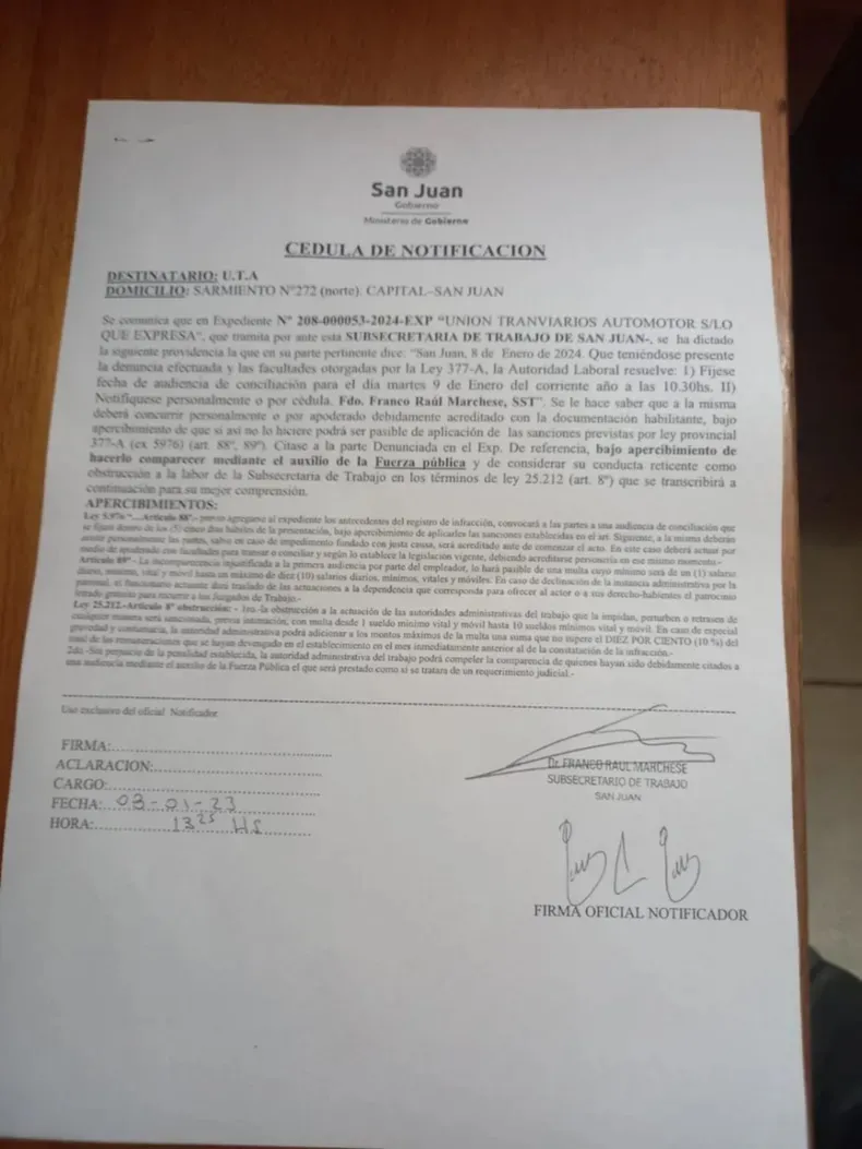 La Unión Tranviarios Automotor (UTA) había comunicado que el miércoles 10 de enero no habría servicio como parte de las celebraciones por la creación del gremio a nivel nacional. En un comunicado, la delegación provincial de la UTA destacó que la decisión de no prestar servicio ese día se toma "en reconocimiento por la tan importante tarea que todos los días realizan al servicio de toda la sociedad sanjuanina". Además, habían alertado sobre la posibilidad de demoras o incluso la falta de actividad durante el día previo.