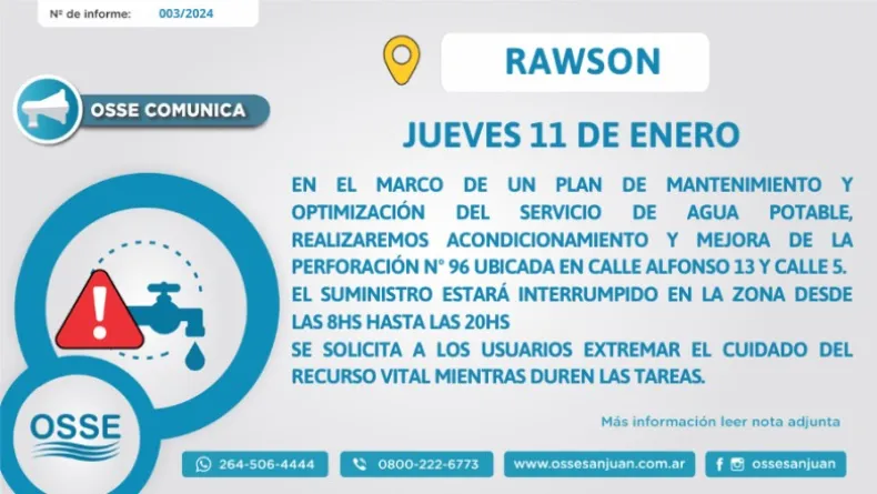 En el marco del plan de Mantenimiento y Optimización del servicio de agua potable, OSSE ha programado importantes tareas de acondicionamiento y mejora en la Perforación Nº 96, ubicada en el departamento Rawson, más específicamente por calle Alfonso XXIII y Calle 5. Estas operaciones están previstas para este jueves 11 de enero.