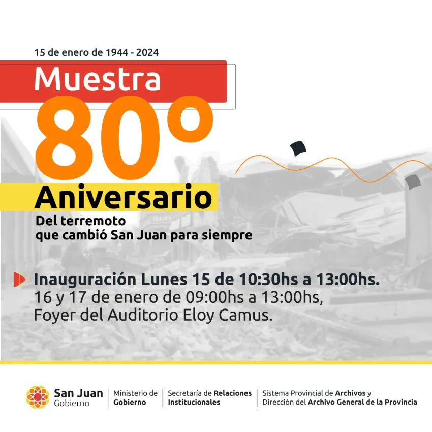 El Ministerio de Gobierno, la Secretaría de Relaciones Institucionales y la Dirección de Archivo General y Sistema Provincial de Archivo realizarán a partir del próximo lunes 15 de enero una muestra con motivo de conmemorarse los 80 años del terremoto de 1944.