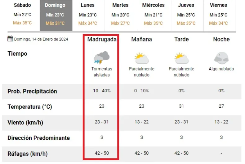 El Servicio Meteorológico Nacional anuncia el ingreso de viento del cuadrante Sur para la madrugada del domingo 14 de enero, con ráfagas que pueden llegar entre 40 y 50 km/h. Hasta las primeras horas de la tarde de mañana seguirá el viento, pero irá bajando la intensidad.