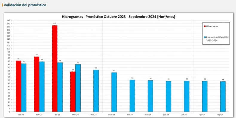 Hubo un pico de precipitaciones y nieve en el mes de diciembre que llevaron a que haya un mayor derrame de agua por el Río San Juan. Esto de alguna manera modificó el pronóstico hídrico que se dio a conocer en noviembre donde se hablaba que el derrame anual era de 732 hectómetros cúbicos desde el mes de octubre del 2023 a septiembre de 2024. Este caudal extra que vino por el río en diciembre sin dudas es un alivio para atender a las necesidades hídricas de la provincia. De todos modos, las autoridades provinciales son conscientes que se tendrá que continuar con el programa de cortas prolongadas en el invierno para poder agregar caudal a los diques que se encuentran casi en el límite mínimo.