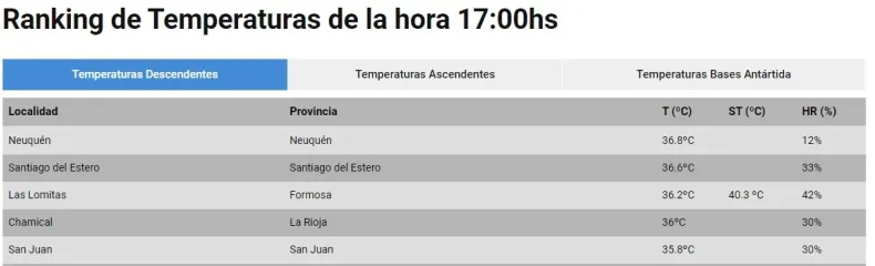 Encima de San Juan, se encuentran jurisdicciones como Chamical, La Rioja; Las Lomitas, Formosa; Santiago del Estero y Neuquén, que pese a ser de la Patagonia, registra la temperatura más alta en la siesta de este sábado, que es de 36.8ºC.