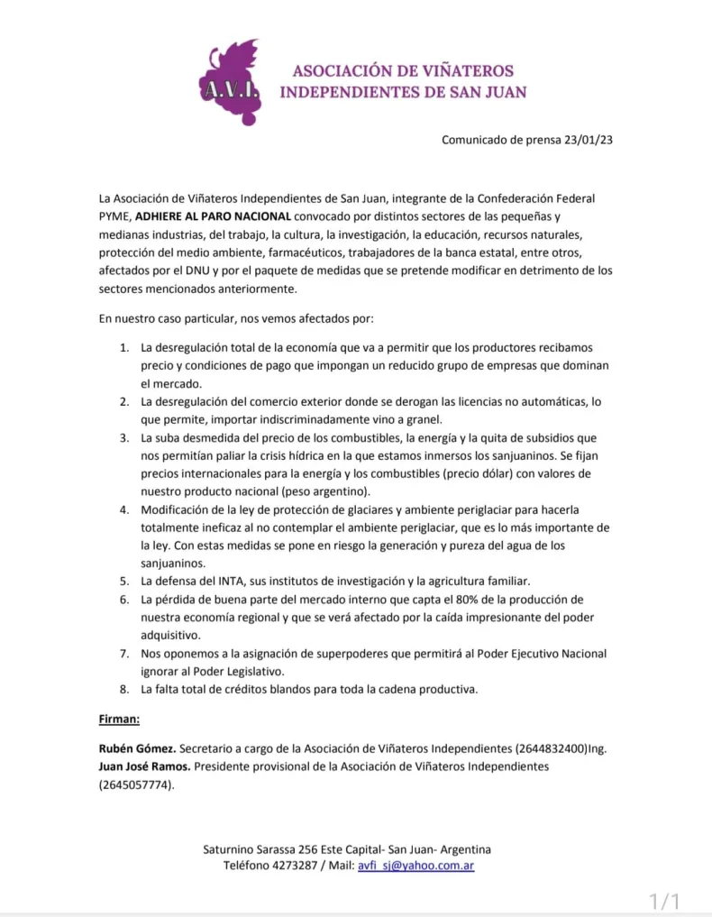 La Asociación de Viñateros Independientes de San Juan, integrante de la Confederación Federal PYME, se adhiere al paro nacional que se realizará mañana 24 de marzo convocado por distintos sectores de las pequeñas y medianas industrias, del trabajo, la cultura, la investigación, la educación, entre otros, afectados por el DNU y por "el paquete de medidas que se pretende modificar en detrimiento de los sectores mencionados anteriormente".