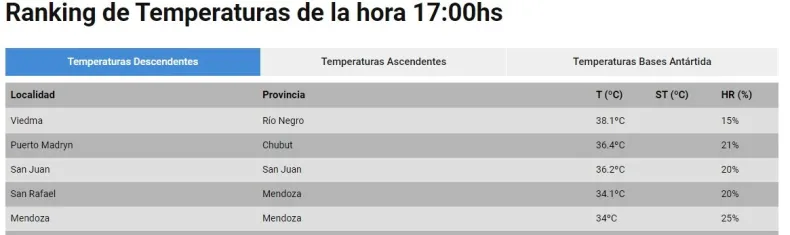 Debajo de San Juan, completanto el Top 5, figura Mendoza, con la localidad de San Rafael y su Ciudad, que registran 34.1º y 34ºC, respectivamente.