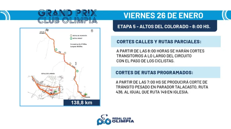 Luego del final apasionante en la cuarta etapa del Grand Prix, los ciclistas ya descansan para estar listos por el día más exigente. Se trata de la denominada "Etapa Reina", que llega a los Altos del Colorado. Esta iniciará en Albardón y es la única que se desarrollará en horas de la mañana, ya que inicia a las 8am.