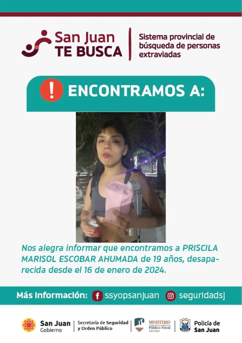 Encontraron a Priscila Marisol Escobar, la adolescente sanjuanina de 19 años, quien estaba desaparecida desde el pasado martes 16 de enero de 2024. Así lo confirmaron desde el Gobierno.