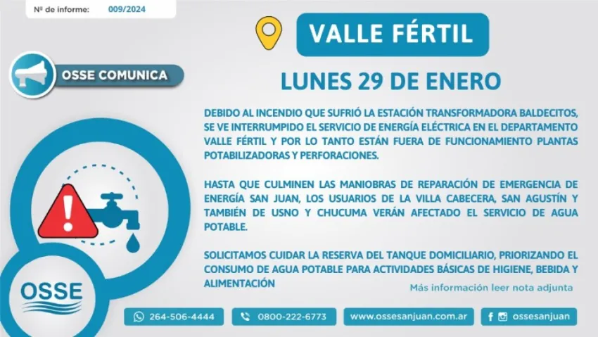 Si bien personal de Energía San Juan trabaja en el lugar realizando maniobras de reparación de emergencia, hasta tanto las mismas no culminen, los usuarios de la villa cabecera, San Agustín, como así también de Usno y Chucuma verán afectado el servicio de agua potable.