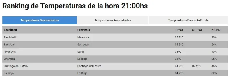 El ranking de temperaturas del Servicio Meteorológico Nacional (SMN), indica que la localidad de San Martín, en Mendoza, es la más caliente con 35,7ºC. Le sigue nuestra querida San Juan con 35,5ºC. El podio lo completa Rivadavia, en Salta, con 35ºC.