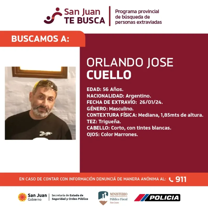 La Policía de San Juan, a través del Programa provincial de búsqueda de personas extraviadas, ha lanzado un llamado urgente para localizar a Orlando José Cuello, de 56 años, argentino, quien fue reportado como desaparecido desde el pasado 26 de enero del presente año.