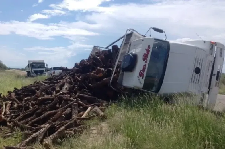 Un experimentado camionero que viajaba junto a sus dos hijos, de 18 y 27 años, se llevaron un gran susto cuando el camión marca Mercedes Benz cargado con leña de algarrobo, volcó perdiendo todo su contenido, quedando esparcidos por el lugar.