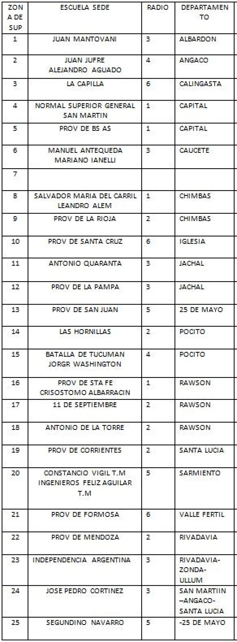 Se ha designado una Escuela Sede en cada departamento o zona para llevar a cabo este proceso. Las Escuelas Sedes son las siguiente: