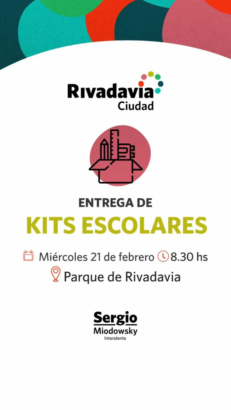 Tal cual estaba previsto, este miércoles a partir de las 8.30, el intendente de Rivadavia junto a autoridades del Ministerio de Familia y Desarrollo Humano, harán entrega de los kits escolares a los chicos que asistieron a la Colonia de Vacaciones del Camping Municipal. Dicha entrega se llevará a cabo en el Parque de Rivadavia.