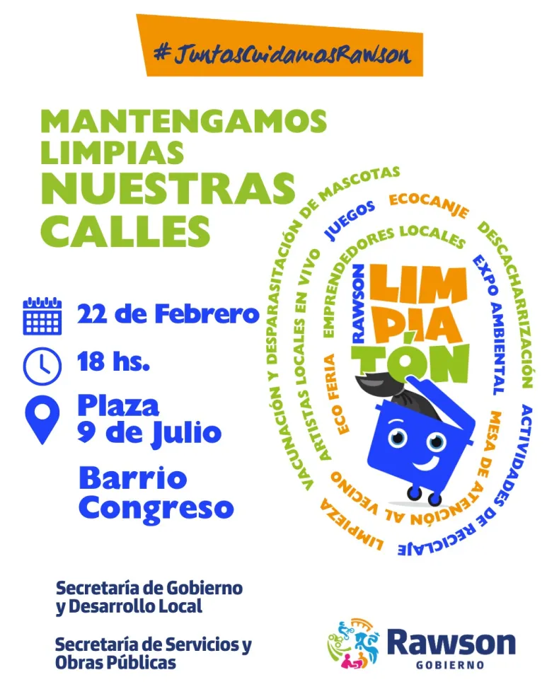 Sin dudas, el intendente de Rawson, le está cambiando la cara al departamento y lo hace junto a los vecinos. De ahí que el próximo jueves, desde las 18 horas, se llevará a cabo una nueva entrega del plan llamado "Limpiatón", sin dudas una iniciativa impulsada por la Municipalidad de la Ciudad de Rawson con el objetivo de sensibilizar a los ciudadanos sobre la importancia de mantener limpios los espacios públicos.