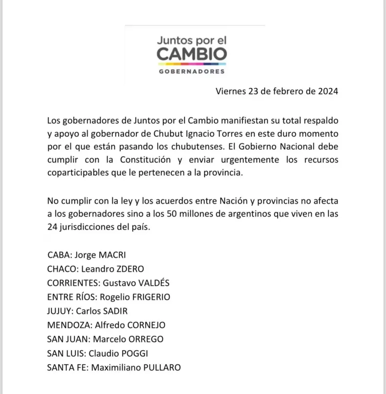 En su apoyo- salieron los gobernadores de JxC, con un documento que fue firmado por el Jefe de Gobierno de la Ciudad de Buenos Aires, Jorge Macri, y los gobernadores de Chaco, Leandro Zdero; Corrientes, Gustavo Valdés; Entre Ríos, Rogelio Frigerio; Jujuy, Carlos Sadir; Mendoza, Alfredo Cornejo; San Juan, Marcelo Orrego; San Luis, Claudio Poggi; y Santa Fe, Maximiliano Pullaro.