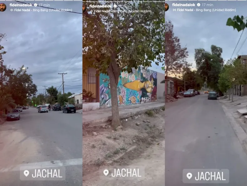 Además, en sus redes sociales, posteó historias, en las que muestra su recorrida por los barrios jachalleros, fascinado con sus veredas y murales.