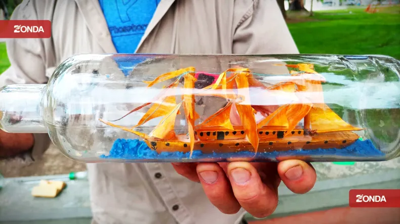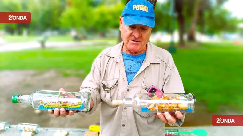 El jubilado fabrica artesanías de modelismo naval adentro de botellas de vidrio, con mucha paciencia y dedicación, pone todo para hacer estas obras de arte. Encuentra en esta actividad un escape y asegura que es el único en cuyo que las fabrica.