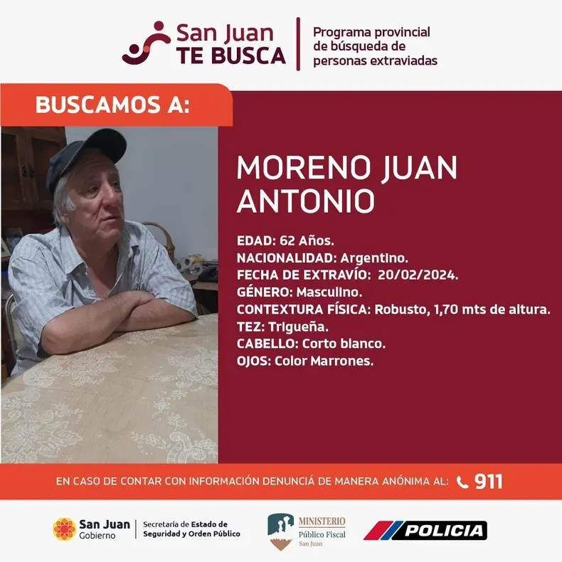 De esta manera, la Policía solicita a todos los sanjuaninos que puedan aportar algún dato sobre el paradero de esta persona, lo haga a la seccional más cercana a su domicilio o aportar alguna información al 911.