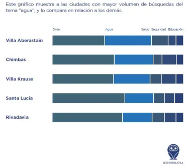Esto se evidencia claramente en la provincia de San Juan que atraviesa una de las peores sequías que se recuerde. Por lo que el tema agua, para esta provincia no es ajeno y de acuerdo a lo que explica este informe "la provincia de San Juan encabeza el ranking nacional de volumen de búsqueda en temas relacionados con el agua". Las provincias que le siguen son San Luis, Neuquén, Catamarca y Río Negro. Vale marcar que cuatro de las cinco provincias nombradas se encuentran al pie de la cordillera de los Andes.