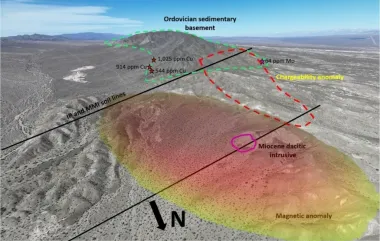 Anomalías geofísicas, geoquímicas y de alteración que indican mineralización de pórfido del Mioceno oculta bajo gravas del Cuaternario.