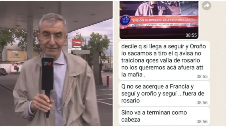 "Decile que si llega a Seguí y Oroño lo sacamos a tiros. El que avisa no traiciona, que se vaya de Rosario. No lo queremos acá", comienza el mensaje que firma "La Mafia" y estaba acompañado de una foto del movilero de TN.