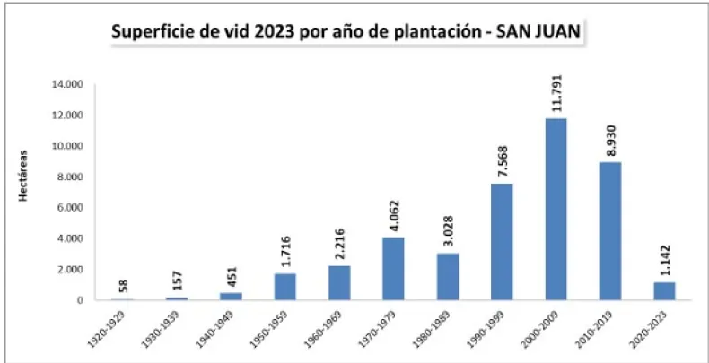 La situación en la provincia de San Juan refleja también una importante caída en la extensión cultivada y en el número de viñedos cuando se hace la comparación con el año 2000 y con el 2023. Los datos oficiales indican que la superficie de vid registrada al 31 de diciembre de 2023 alcanza las 41.118 ha distribuidas en 4.502 viñedos.