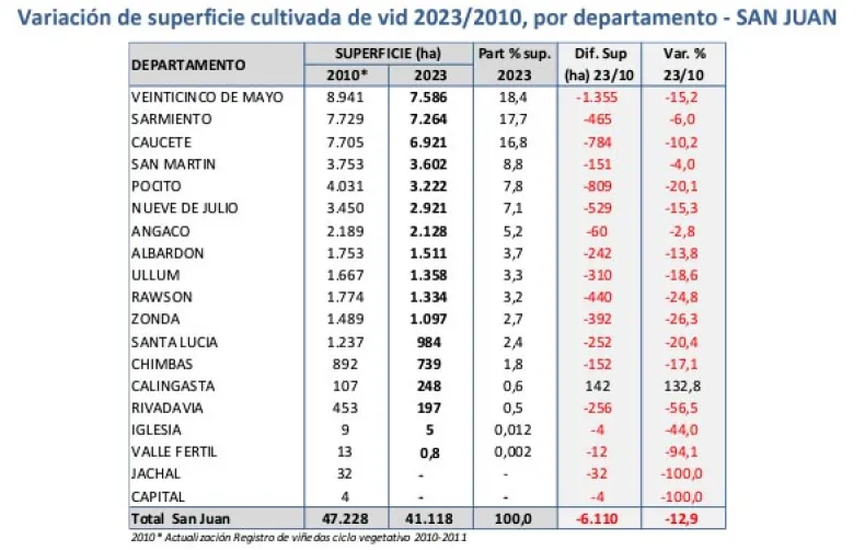 A su vez hubo una importante caída en la cantidad de hectáreas cultivadas de viñedos en los departamentos que tienen una alta tradición vitivinícola. En ese sentido se puede decir que los que registraron una mayor disminución de superficie en el período 2010-2023 fueron: 25 de mayo (-1.355 ha), Pocito (-809 ha), Caucete (-784 ha), 9 de Julio (-529 ha) y Sarmiento (-465 ha).