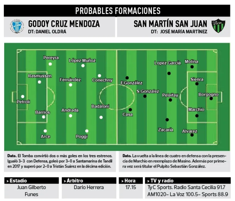 En tanto que Lopez García vuelve al sector derecho del medio juego y el dato saliente sin dudas es que por primera vez en el torneo será titular el Pulpito Sebastián González en la zona del medio juego como el enganche del equipo y tratando de asisitir a Fede González y al mejor jugador que ha tenido San Martín en lo que va de la temporada: Maxi Casa.