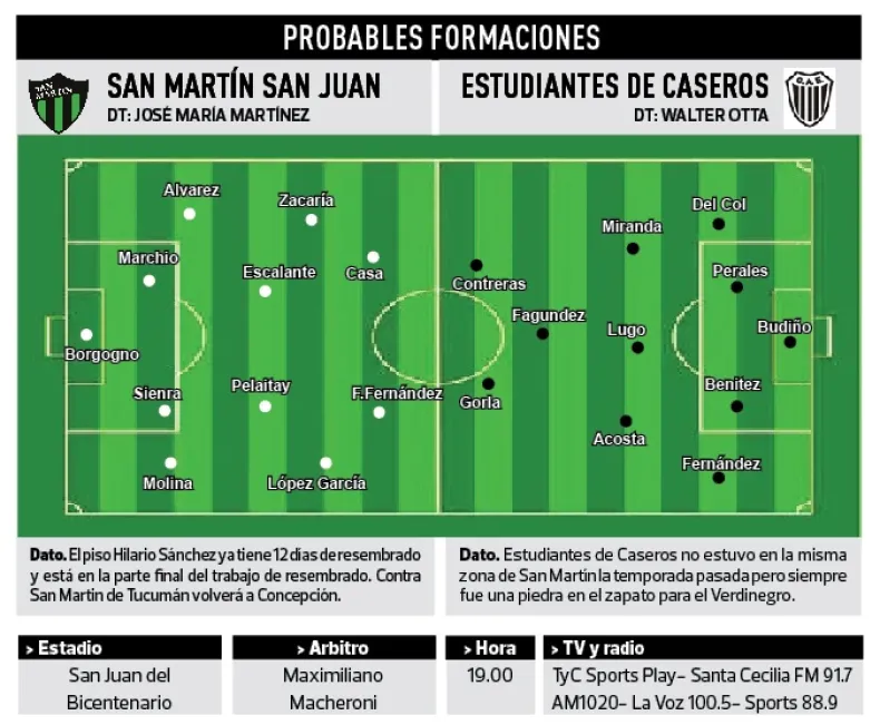 Para cumplir con éxito esta misión el entrenador de San Martín Pancho Martínez mete mano en el equipo en todas las líneas y vuelve al esquema tradicional con el que empezó jugando en este torneo con cuatro en el fondo, cuatro en el medio y dos arriba.