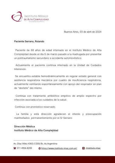 Según el comunicado oficial, el paciente continúa internado en la Unidad de Cuidados Intensivos, presentando un estado hemodinámico estable pero con un estado general considerado regular. Serrano sigue recibiendo asistencia respiratoria mecánica debido a una insuficiencia respiratoria derivada del accidente.