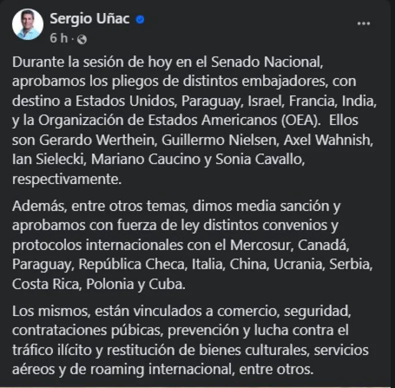"Durante la sesión de hoy en el Senado Nacional, aprobamos los pliegos de distintos embajadores, con destino a Estados Unidos, Paraguay, Israel, Francia, India, y la Organización de Estados Americanos (OEA). Ellos son Gerardo Werthein, Guillermo Nielsen, Axel Wahnish, Ian Sielecki, Mariano Caucino y Sonia Cavallo, respectivamente.