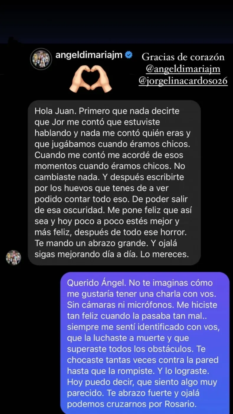 "Hola Juan. Primero que nada decirte que Jor me contó que estuviste hablando y me contó quién eras y que jugábamos cuando éramos chicos. Cuando me contó me acordé de esos momentos cuando éramos chicos. No cambiaste nada", contó Di María sobre cómo su esposa Jorgelina lo ayudó a recordarlo.