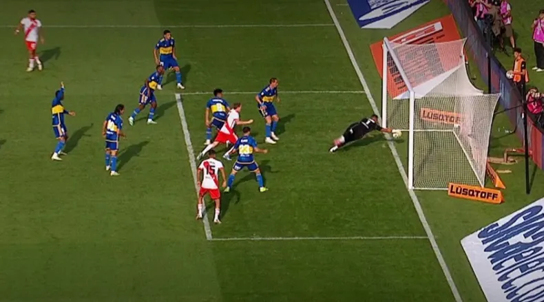 Romero la sacó de adentro del arco, pero la pelota no ingresó en su totalidad. Boca, luego, amplió la diferencia.