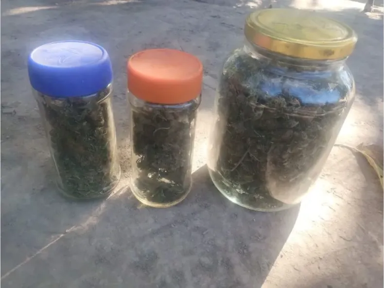 Es allí donde los policías encuentran dos plantas de cannabis sativa, por lo que luego de buscar en la zona dan con un rancho vecino donde encuentran los frascos y plantas que estaba siendo secadas en el techo.