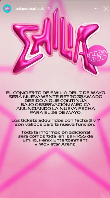 La noticia fue confirmada a través de las redes sociales oficiales de la cantante y su empresa de representación, WK Entertainment. En un comunicado publicado en Instagram, se informó que Mernes "continúa bajo observación médica" y que "debido a esto, el concierto del 7 de mayo se pospone nuevamente para el 26 de mayo".