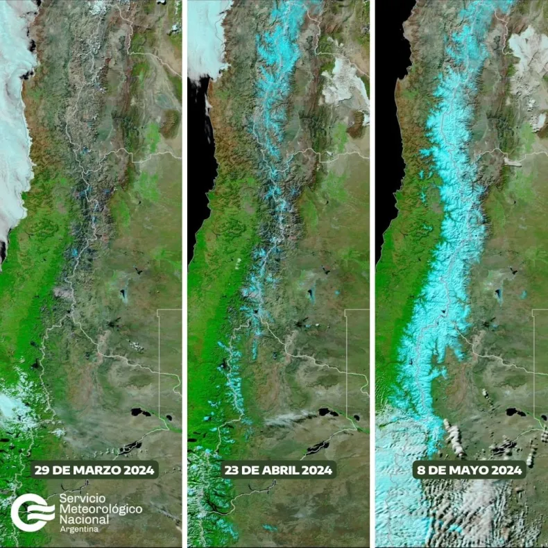 El Servicio Meteorológico Nacional publicó en los últimos días imágenes satelitales que revelan una sorprendente acumulación de nieve en las regiones de Cuyo y la Patagonia Argentina, mostrando un esperanzador panorama tras la crisis hídrica que vivió la población.