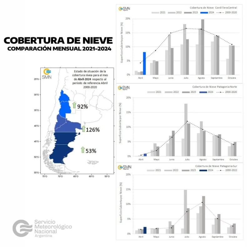 El mes de abril se destacó por su excepcional actividad de nevadas, como nunca antes registrado. Los datos gráficos y mapas lo corroboran, evidenciando un aumento significativo en la cantidad de nieve comparado con los meses de abril de años anteriores.