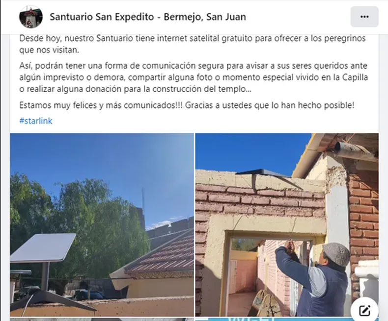 Otro de los departamentos que sumó a este avance la tecnología es Caucete, ya que en sus redes sociales la comunidad del Santuario de San Expedito, en la zona de Bermejo, ya cuentan con conexión de internet gratuito, sobre todo donde se encuentra levantado el Santuario a San Expedito. Avance que pudo ser posible gracias al servicio de internet es de la empresa Starlink, de Elon Musk.