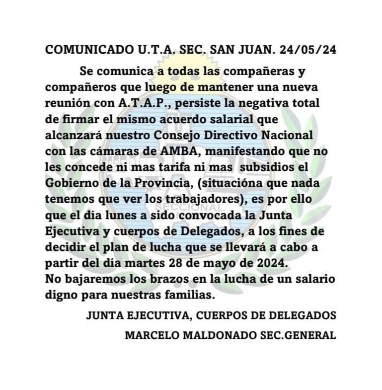 "Persiste la negativa total a firmar el mismo acuerdo, manifestando que el gobierno provincial no les concede ni más tarifas ni más subsidios", indica el comunicado emitido por la UTA. Ante esta situación, los delegados se reunirán con la Junta Ejecutiva este lunes para definir "el plan de lucha que se llevará a cabo a partir del 28 de mayo", concluye el texto.