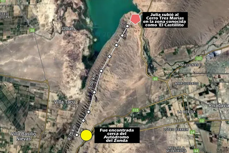 Eso fue registrado por cámaras del CISEM y, posteriormente, constataron los registros de los dispositivos del EPSE, empresa que obra justo en el Dique de Ullum. En esas imágenes, se puede apreciar cuando Julia llega y se toma una fotografía, para continuar su travesía.