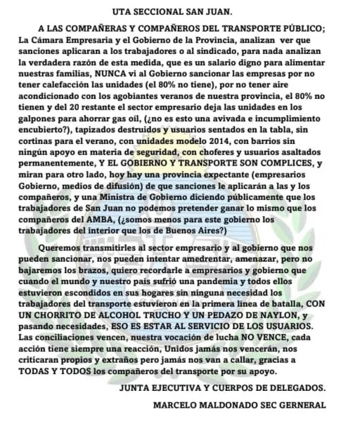 En este marco, el secretario general de UTA en San Juan, Héctor Maldonado, dialogó con Zonda TV y se refirió a la medida de fuerza que anunciaron ayer, e insistió que"la medida se notificó dentro de los términos de la ley".