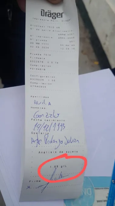 Se le realizó una prueba de alcoholemia a Ávila, arrojando un resultado de 1.69 gramos de alcohol por litro de sangre, por lo que quedó detenido. Afortunadamente, el motociclista no necesitó ser trasladado al hospital, ya que solo sufrió golpes leves.