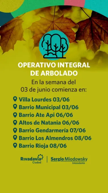 La Municipalidad de Rivadavia Ciudad inicia su cuarta semana del Operativo Integral de Arbolado, llevando a cabo importantes intervenciones en siete barrios del departamento. Este operativo se desarrollará del 3 al 8 de junio y forma parte del calendario de intervención de especies arbóreas diseñado por la municipalidad.