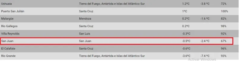 San Juan amaneció este lunes con temperaturasmuy heladas, situándose como la tercera provincia más fría del país. Con una mínima de -2.4°C, la provincia solo fue superada por las localidades del Calafate (Santa Cruz) y Río Grande (Tierra del Fuego).