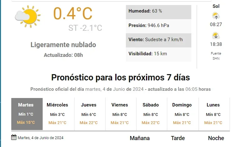 Durante la mañana se espera la presencia de neblina, por la alta humedad que se ubica en el 66%. Para el resto de la jornada, el panorama cambia, ya que se espera un fuerte aumento de temperatura y se espera una máxima de 21°C. Además, se espera un cielo algo nublado con vientos leves del sector norte.