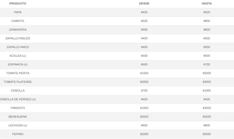 La Municipalidad de la Ciudad de San Juan informó los precios de referencia de los productos que los puesteros y comerciantes ponen a disposición en la Feria y Mercado de Abasto. Ubicada en calle25 de Mayo 842-900 (este) ofrece los siguientes precios en verduras, frutas y carne: