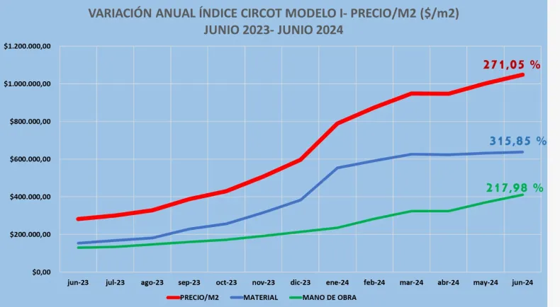 Por ello el costo del metro cuadrado se ubicó en $1.048. 924,36. En lo que va del año, los costos subieron un 32,90%. Mientras que si se compara con el mes de junio del 2023, los incrementos alcanzaron el 271,05%.