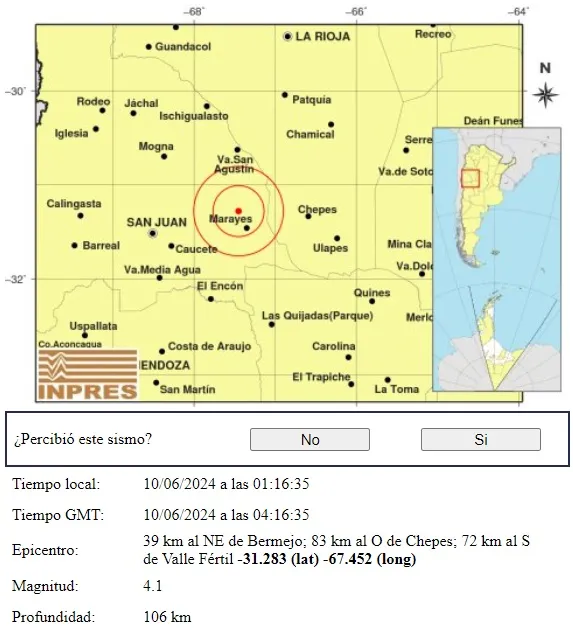 En la madrugada de este lunes, a la 1:16 horas, un fuerte temblor sacudió el suelo de los sanjuaninos. Según el Instituto Nacional de Prevención Sísmica (INPRES), la magnitud del movimiento fue de 4,1 grados en la escala de Richter, mientras que tuvo una intensidad de II a III en la escala de Mercalli.