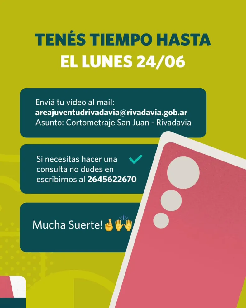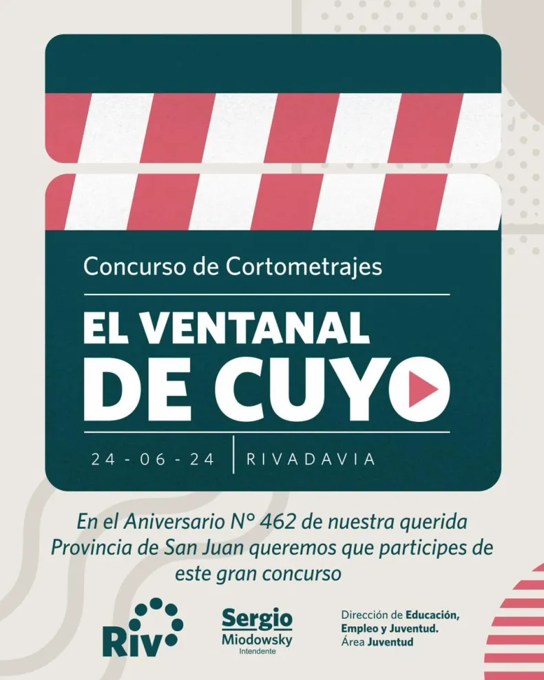 En el marco del 462° aniversario de la fundación de la ciudad de San Juan, la municipalidad de Rivadavia anuncia el lanzamiento del concurso de cortometrajes "El Ventanal de Cuyo", una iniciativa destinada a fomentar la creatividad de los jóvenes y destacar el rico patrimonio cultural de San Juan.